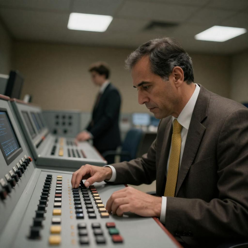 Middle-aged man with dark hair, wearing brown suit and yellow tie, intensely focuses on a complex control panel with numerous buttons and dials. Background includes dimly lit room with another person standing. Ceiling lights illuminate the scene.