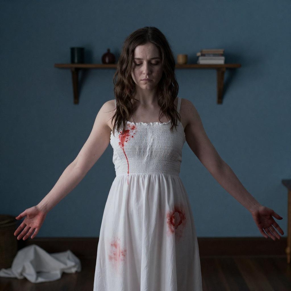 Photograph of a woman with shoulder-length brown hair, wearing a white dress stained with red blood on her arms and dress. She stands in a dimly lit room with blue walls, a wooden shelf with various items, and a white cloth on the floor. Her arms are outstretched, and she looks downward with a somber expression.