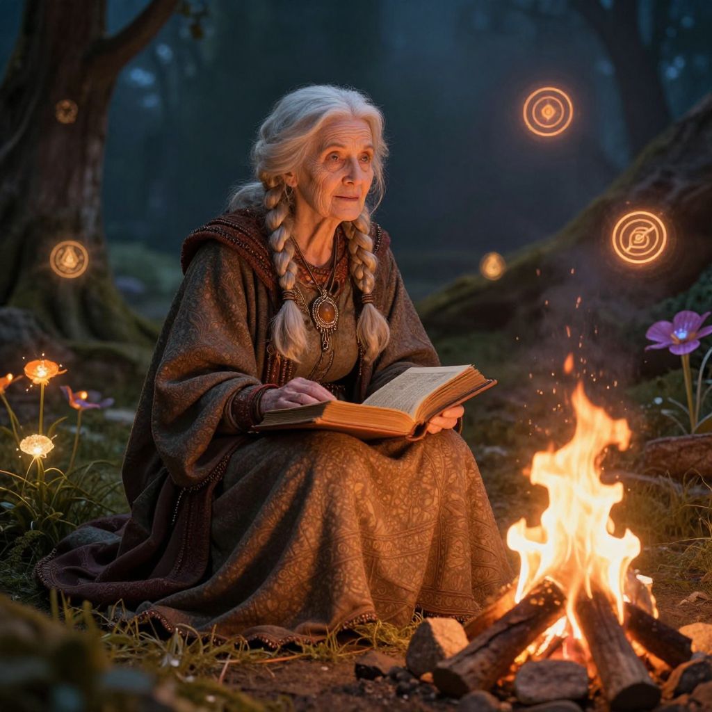 Sage depicted as a wise old woman in a fantasy landscape, sitting by a campfire with an open ancient book, surrounded by glowing plants and floating magical symbols, rich colors and dramatic lighting emphasizing wisdom and mystery