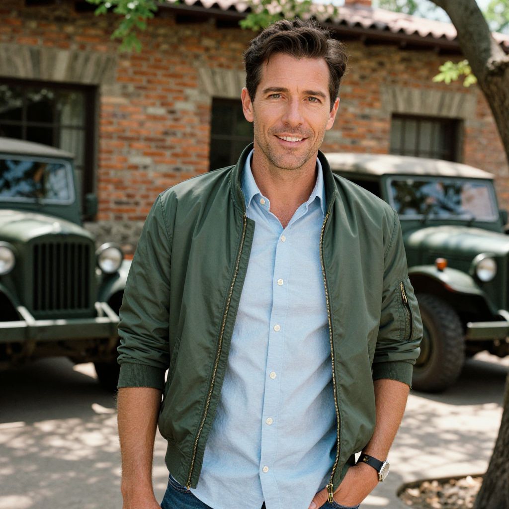 A man, performance chinos, light blue short-sleeve button-up, forest green bomber jacket, rustic brick facade, vintage military vehicles, sun-dappled courtyard, 3M ferrania analog film stock, relaxed smile, confident demeanor. Man has masculine face and piercing eyes