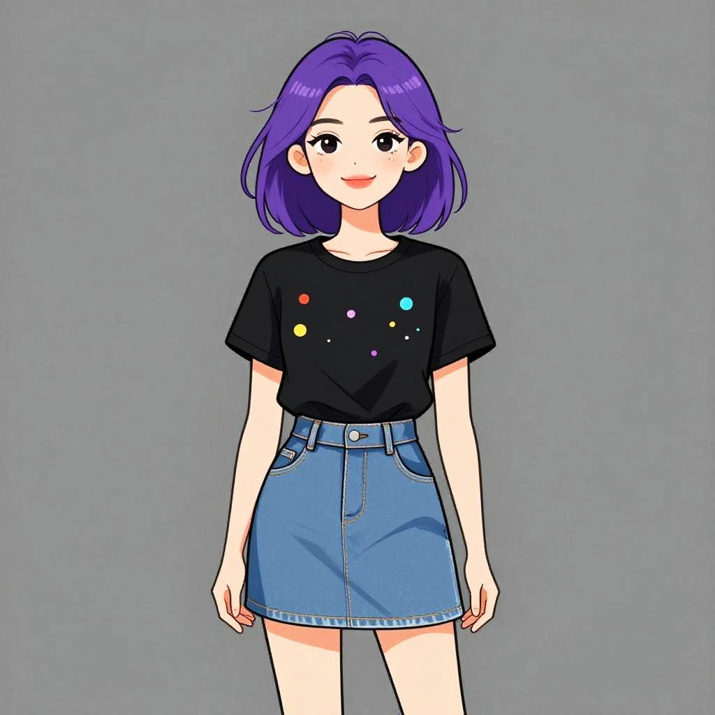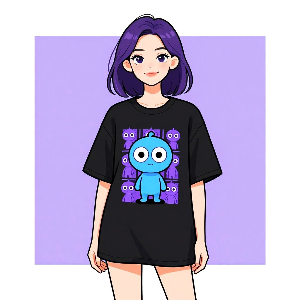 This is a digital anime-style drawing of a young woman with shoulder-length, straight purple hair and fair skin. She has a gentle smile and large, expressive purple eyes. She is wearing a black oversized T-shirt with a colorful cartoon blue character with large eyes on the front. The background is a solid, light purple square. The woman's T-shirt is loose, covering her upper thighs, and she stands with a relaxed posture. The overall style is clean and vibrant, with bold lines and bright colors.