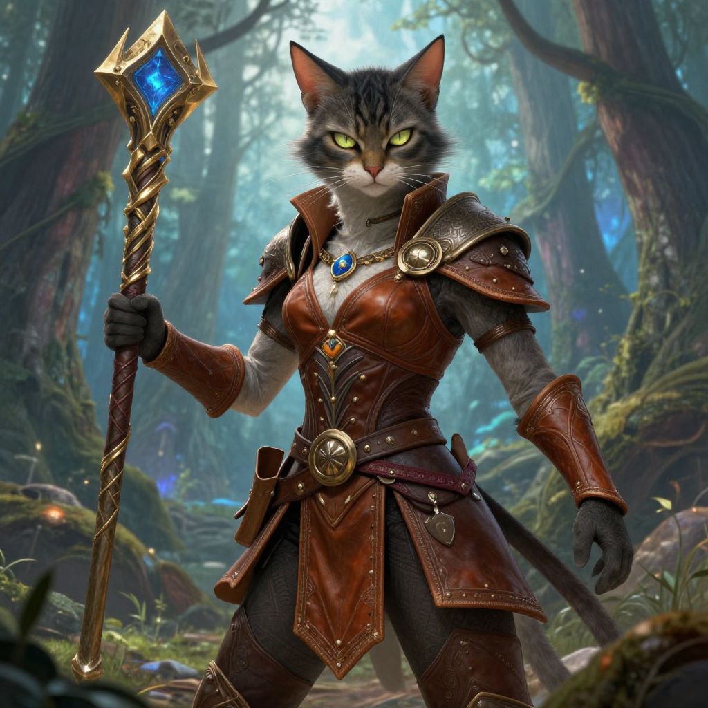 Cat person DnD adventurer in detailed leather armor, sly feline eyes glowing, holding a magical staff in a mystical forest, fantasy style, intricate costume design, vibrant colors, dynamic pose, enchanted atmosphere, high-resolution, digital painting.