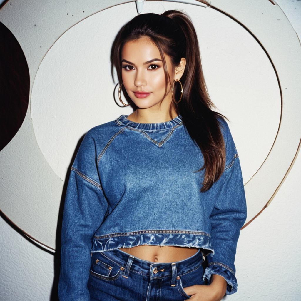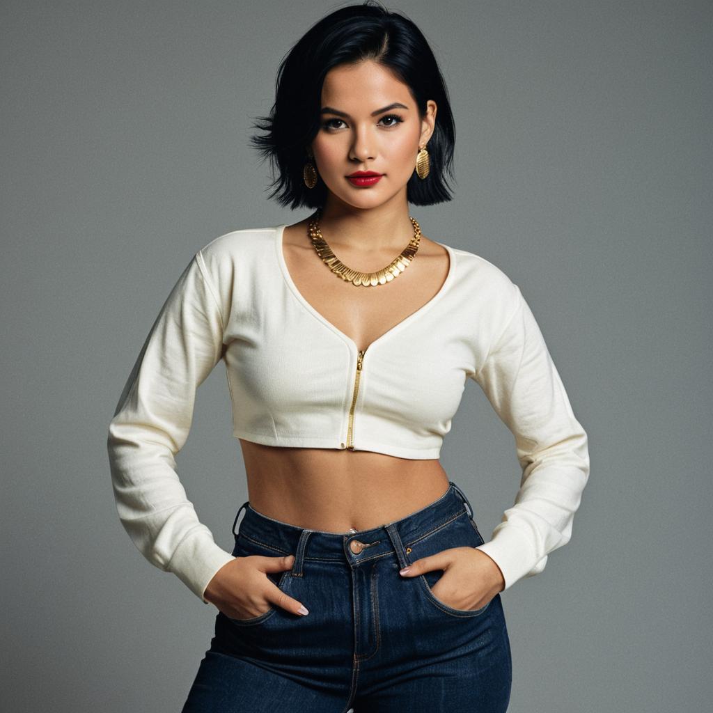 Portrait of a confident young woman with short black hair wearing a white long-sleeve crop top with a zipper front and dark blue high-waisted jeans. She accessorizes with a gold necklace and matching gold earrings, posing with her hands in her pockets against a neutral gray background.