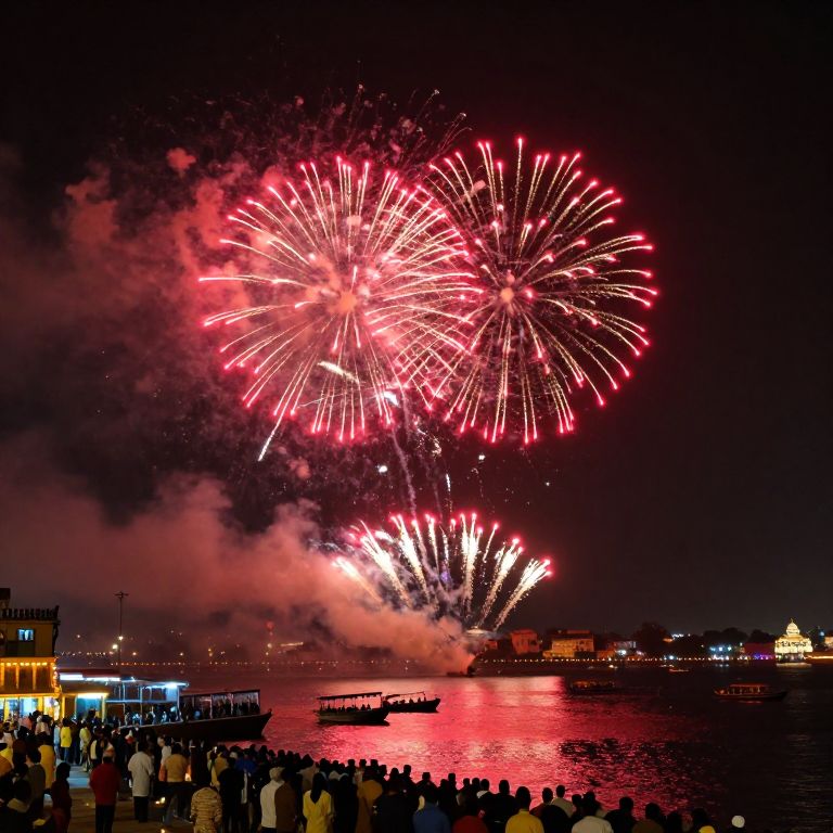 Brilliant red fireworks explode in tandem above a festive waterfront, illuminating the night sky as crowds gather along the shoreline and aboard boats during Diwali celebrations in Amritsar on October 27, 2019.