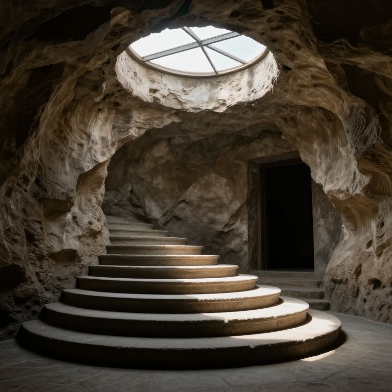 Circular stone steps ascend through a sunlit skylight, illuminating a cavernous interior with textured walls and a darkened doorway to the side, creating a mystical interplay of light and shadow.