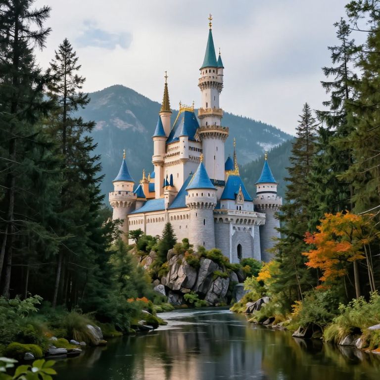 Photograph of a fairy-tale castle with blue-tipped turrets and golden accents, situated on a rocky outcrop by a reflective river. The castle is surrounded by dense, tall evergreen trees and autumn-colored foliage. In the background, misty, forested mountains rise under a partly cloudy sky. The castle's white stone walls contrast with the dark green and orange hues of the trees and leaves, creating a magical, enchanted forest atmosphere. The river in the foreground mirrors the castle and trees, adding to the picturesque scenery.