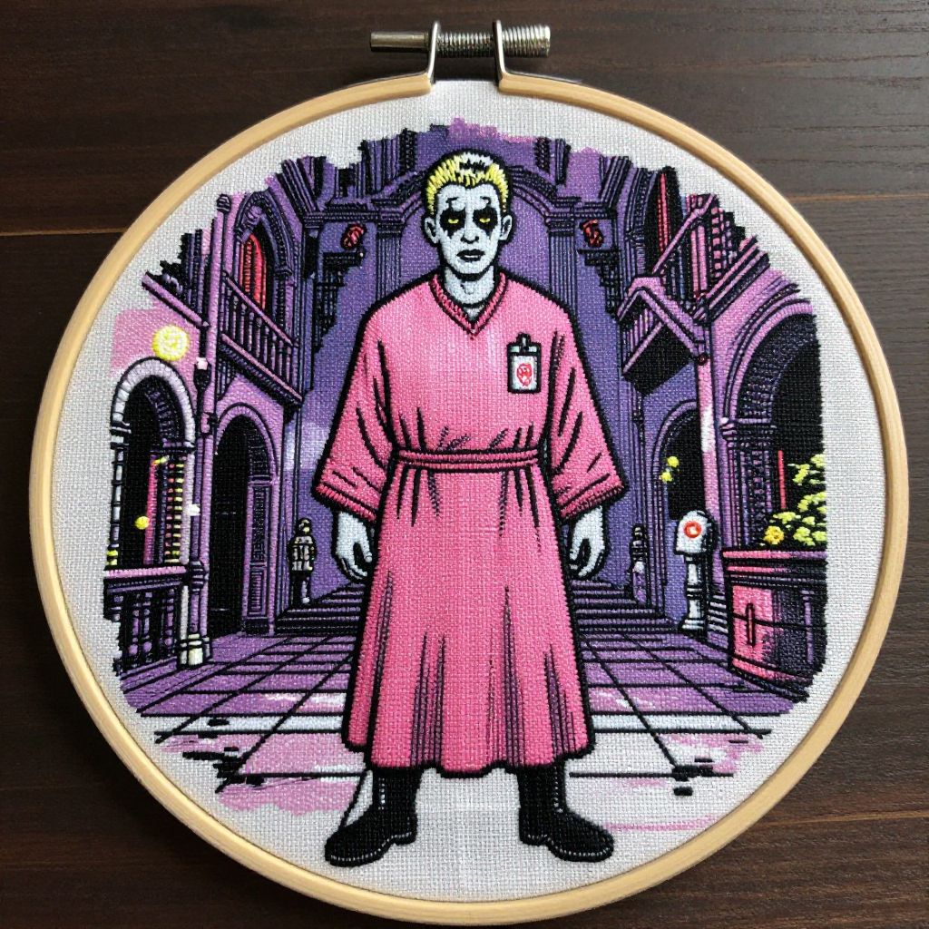 Embroidery Hoop doctor strange comics style, man with short bleached hair, full body, make up face, in ancient mansion, mystical atmosphere, pink dressing gown, comic book,