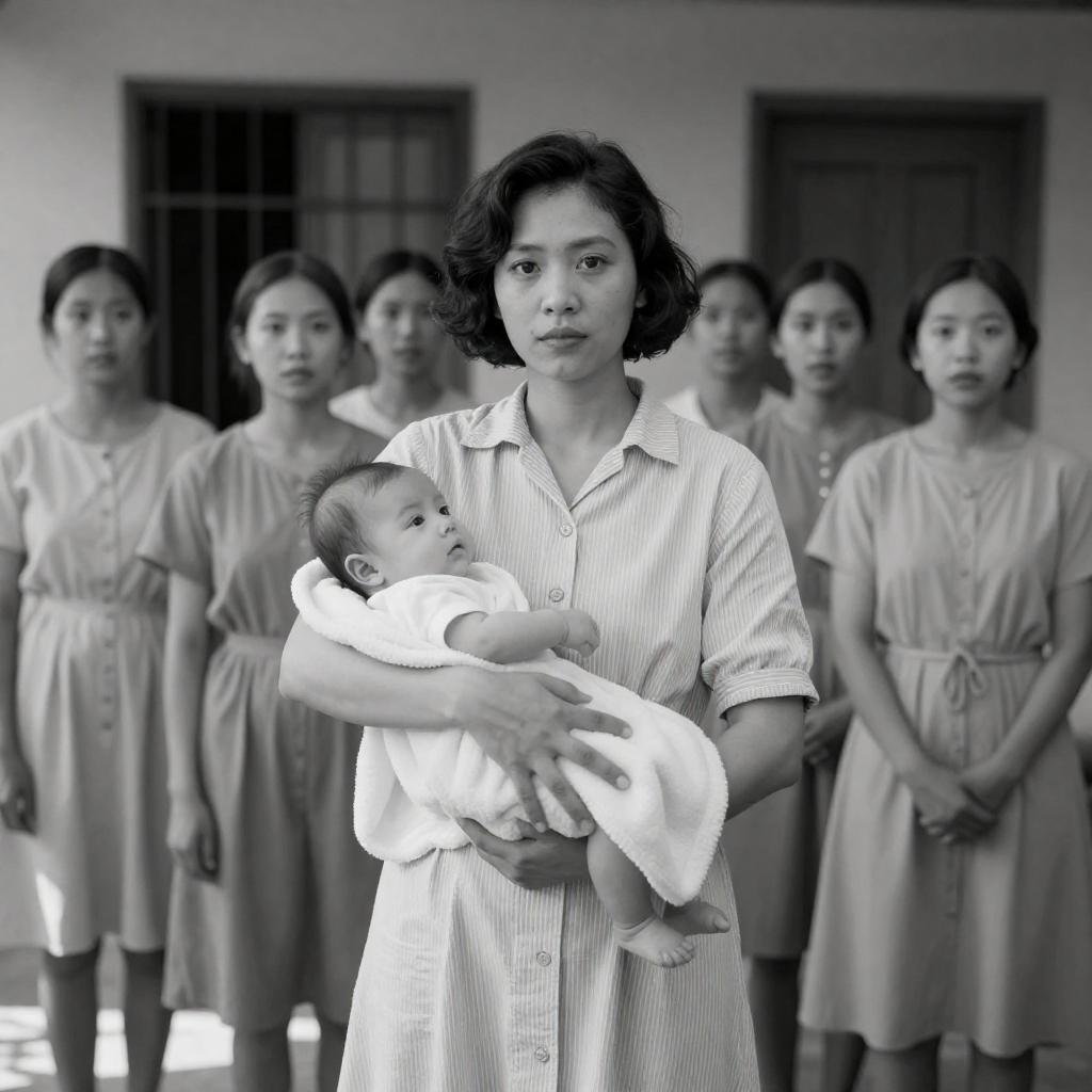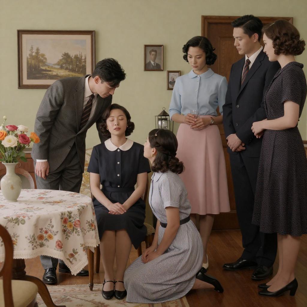 Photograph of a family walking on a sunny road. Asian man in black suit and hat carries young boy in beige clothes. Five women and one child follow, wearing 1940s-style dresses and straw hats. Green grass, trees, and mountains in background. Man's intense expression, others smiling. Road curves slightly left. Clear blue sky above.