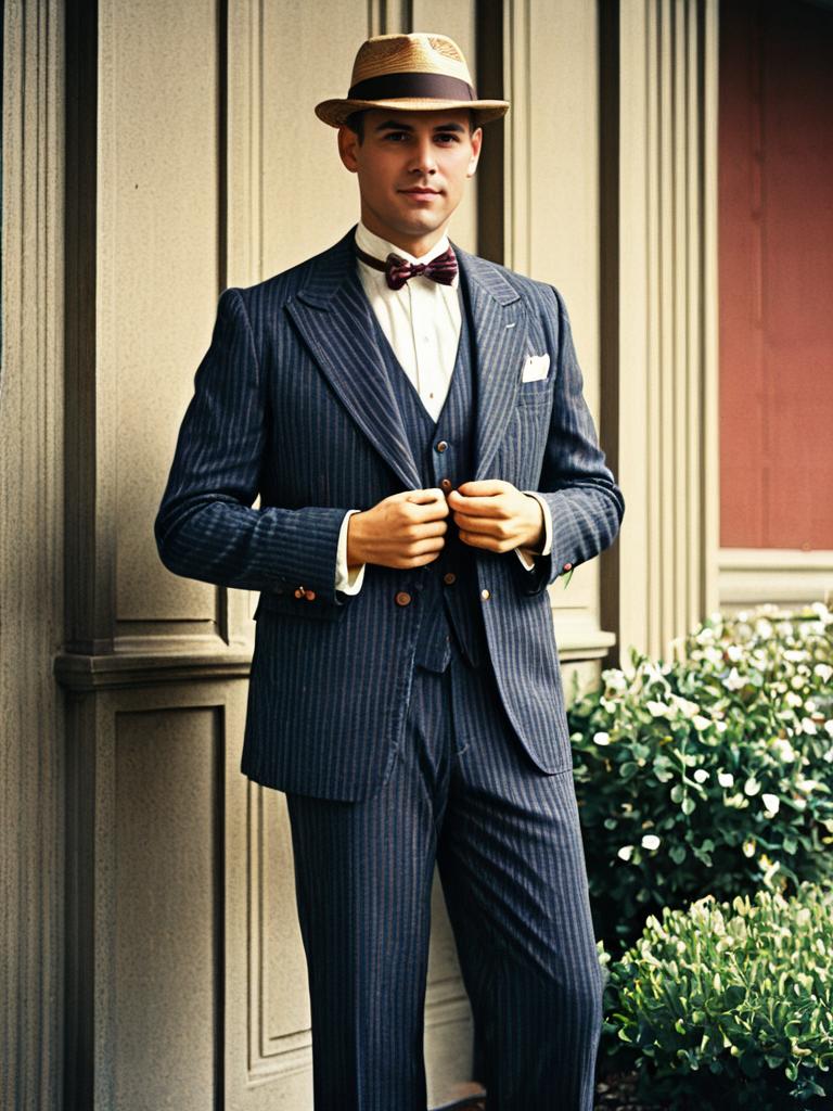 Man in 1920s Pinstripe Suit and Straw Hat