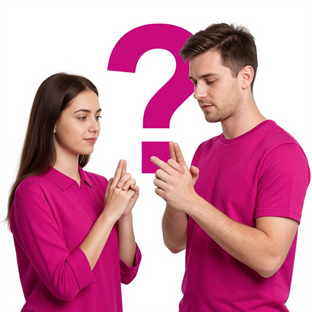Gesture Control incognito man and woman in magenta color, on the background of a question mark, ultra quality, white background,