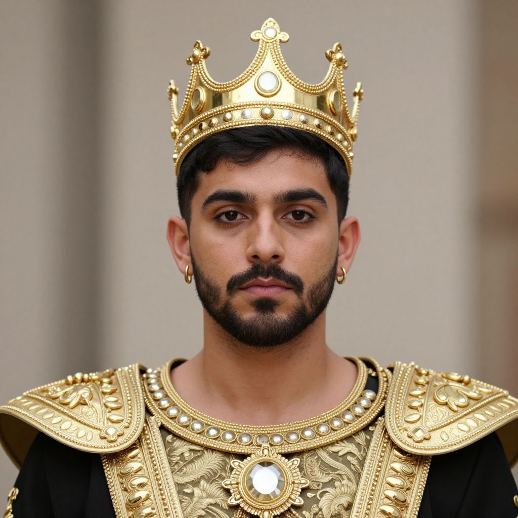 Portrait of a young man with black hair and facial hair wearing an ornate gold crown and matching detailed gold armor costume. He has gold hoop earrings and a serious expression, looking directly at the camera. The intricate armor features decorative elements and jewels, highlighting a royal or kingly theme.