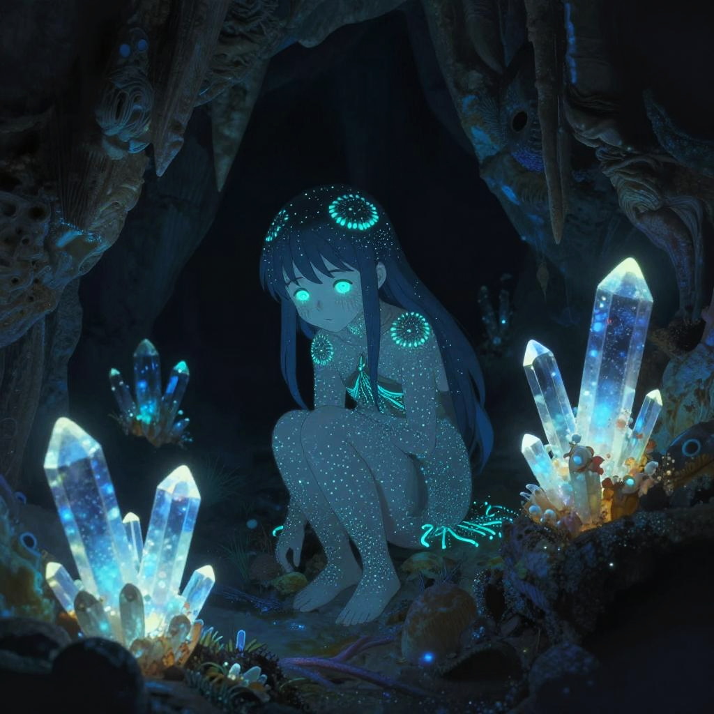 A bioluminescent cave dweller, with glowing fungal markings, surrounded by radiant crystal clusters, in a mysterious subterranean cavern, depicted in the genre-blending and ethereal style of Yoko Kanno.