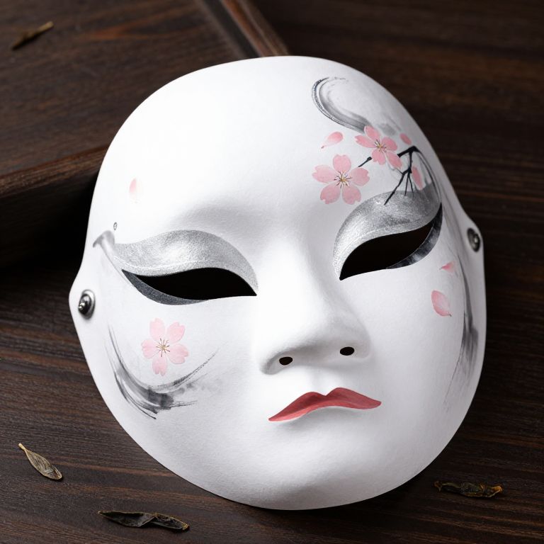 Geisha mask with expressive delicate features, decorated with subtle silver accents and painted sakura petals, surrounded by swirling ink brush strokes symbolizing traditional Japanese art, placed on a dark wood surface with scattered tea leaves, evoking ritual and tradition.