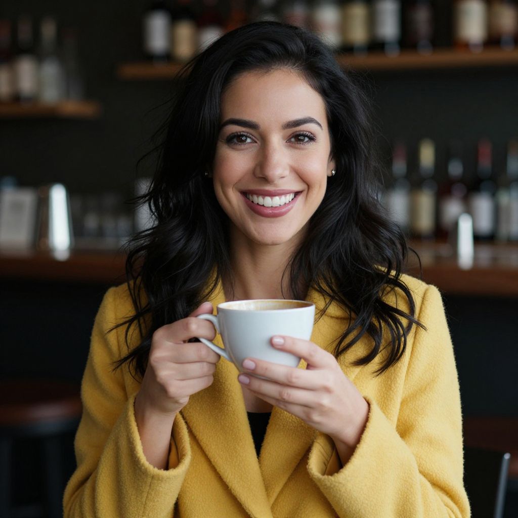 Photograph of a smiling woman with long, wavy, black hair, fair skin, and dark eyes, holding a white ceramic cup with both hands. She wears a bright yellow, textured, woolen coat. The background is a blurred bar with shelves filled with various bottles. The lighting is soft, highlighting her cheerful expression and the cup. The overall style is modern and warm, with a focus on the woman's friendly demeanor and the cozy atmosphere of the bar.
