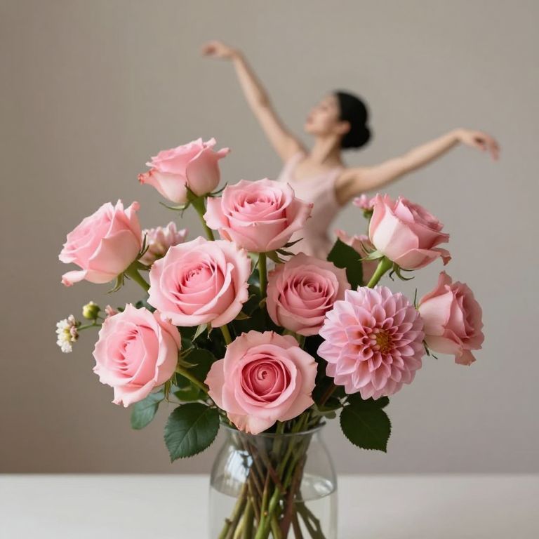 Photograph of a glass vase filled with a bouquet of pink roses and a single pink dahlia. The flowers have soft, delicate petals with dark green leaves. In the blurred background, a ballet dancer with fair skin and dark hair is captured in an elegant, arm-outstretched pose, wearing a pink, sleeveless leotard. The dancer's figure is slightly out of focus, emphasizing the vibrant, detailed flowers in the foreground. The background is a plain, light gray, providing a neutral contrast to the pink hues of the flowers and dancer's leotard. The image has a soft, natural light, giving it a gentle, romantic feel.
