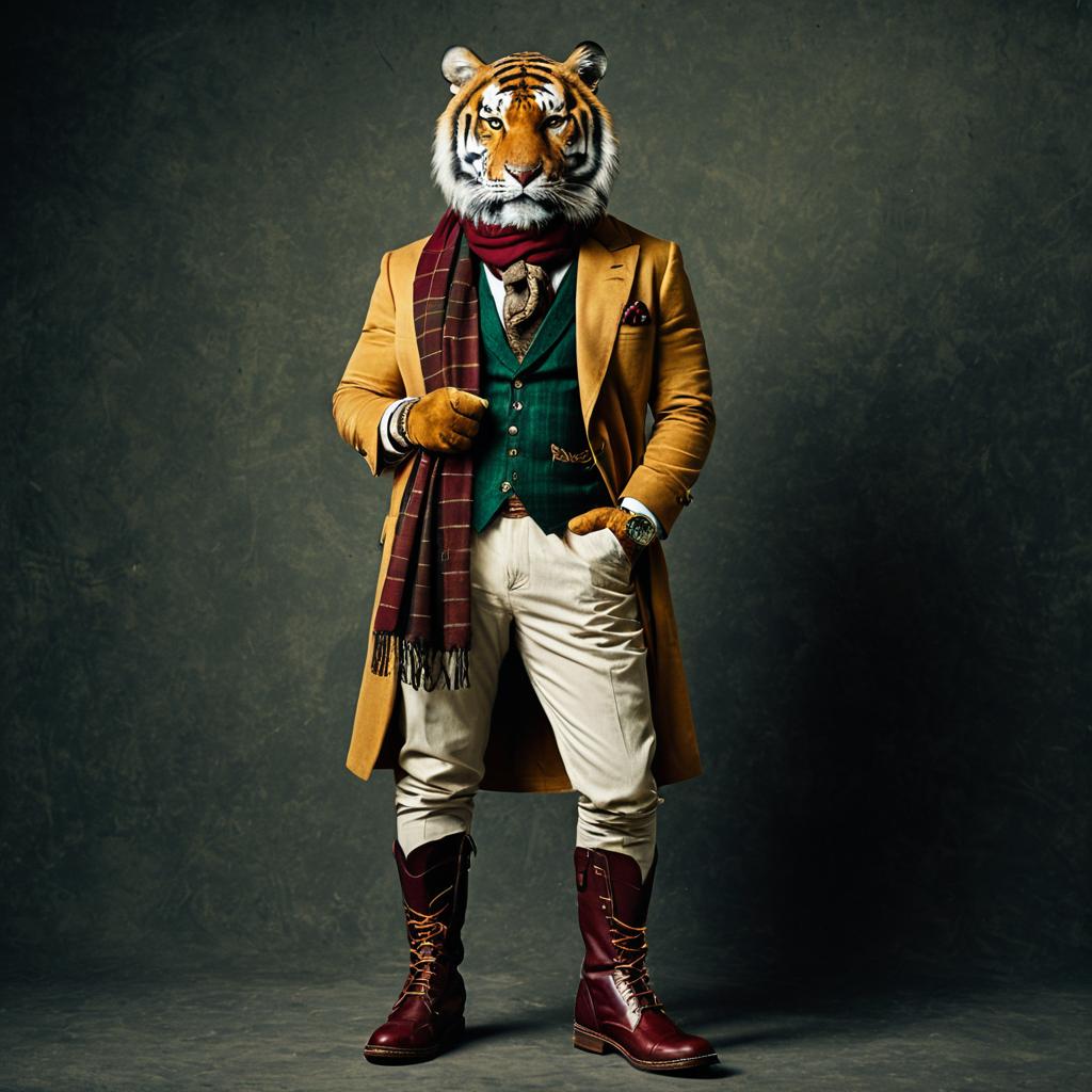 Hyper-realistic wolf standing and dressed in leather clothes with a color palette of grays, black, dark blues, deep reds in both plaids and solids. The wolf wears black polished boots, a chain pendant necklace, silver buckle belt, capturing a sophisticated and classic look. Each clothing piece is detailed with realistic textures and tones, showcasing the blend of elegance and natural power in a finely dressed, anthropomorphic style.