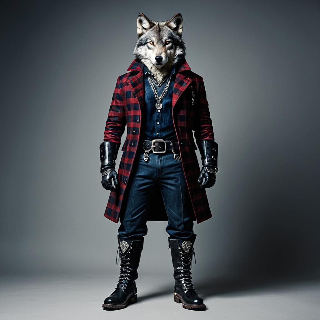 Hyper-realistic image of a wolf standing upright, dressed in a red and black plaid long coat over dark blue denim clothing. The wolf wears black polished leather boots, black leather gloves, a silver buckle belt, and a chain pendant necklace. The outfit blends textures of leather and fabric in grays, blacks, dark blues, and deep reds. The anthropomorphic wolf exudes a classic and sophisticated look with intricate details and realistic fur and clothing textures against a neutral gray background.
