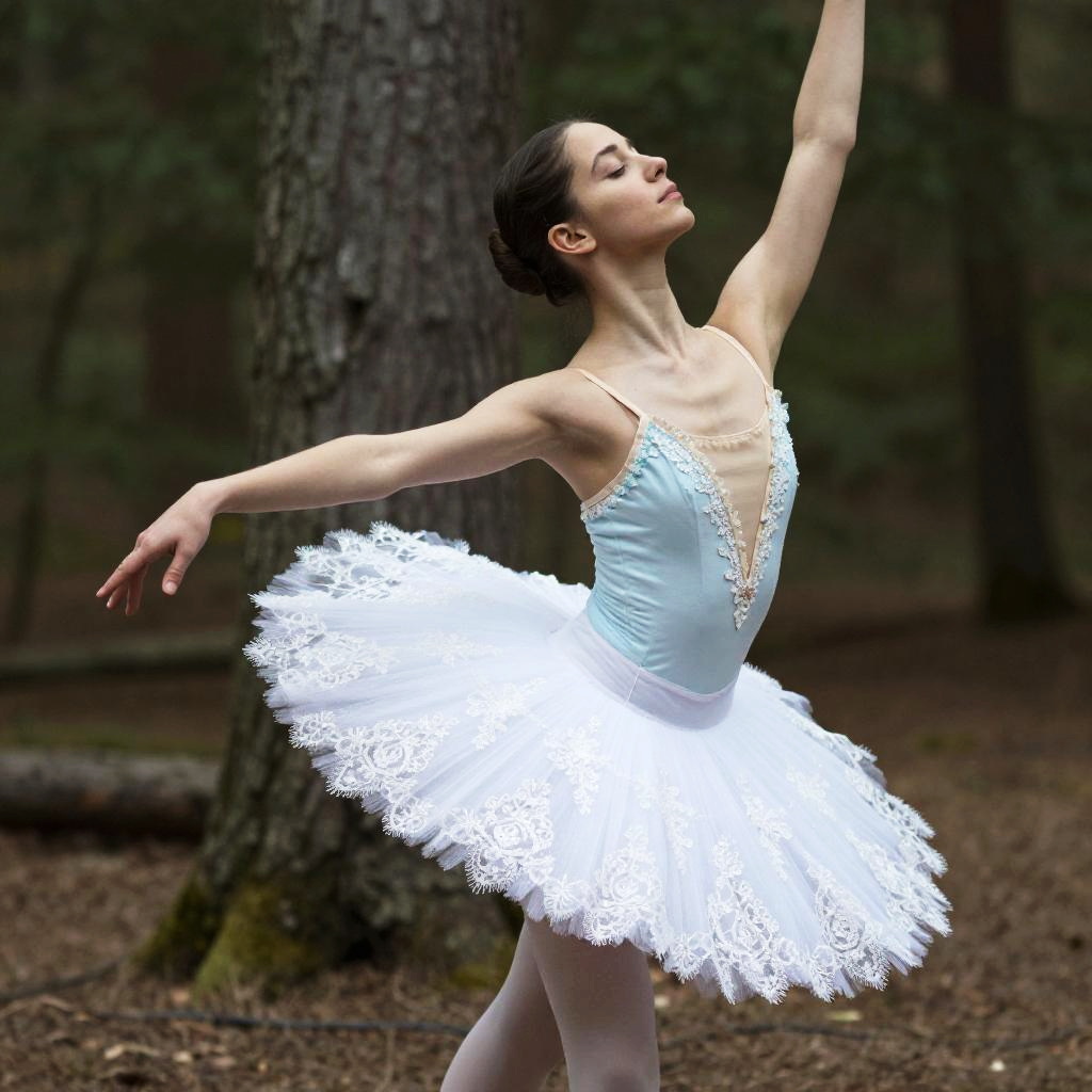Photograph of a delicate ballerina in a white lace tutu and light blue bodice, gracefully dancing in a forest. Her arm is raised