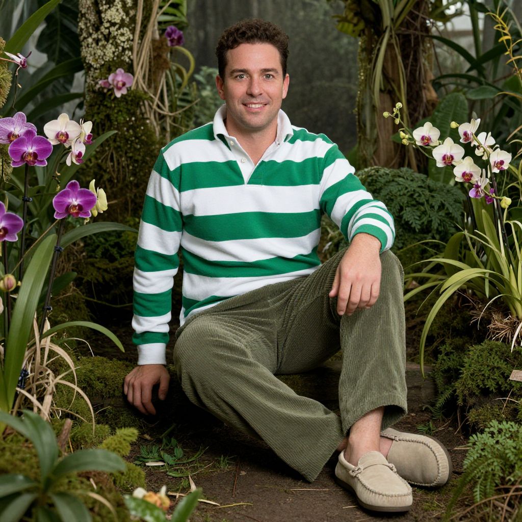A man, classic striped rugby shirt in green and white, olive corduroy trousers, beige suede moccasins, lush rainforest canopy, vibrant orchids, hand-tinted photograph, relaxed smile.Man has masculine face and piercing eyes