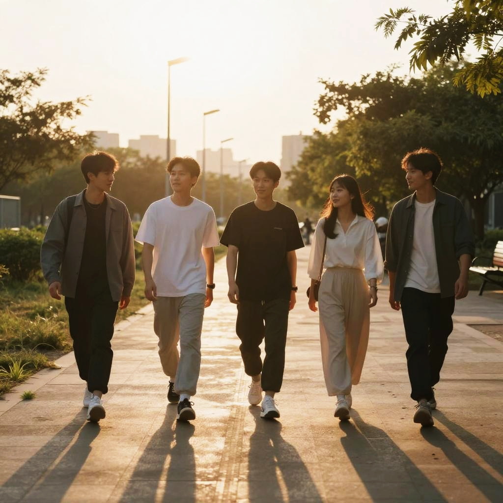Golden Hour Group Walk in Sunlight