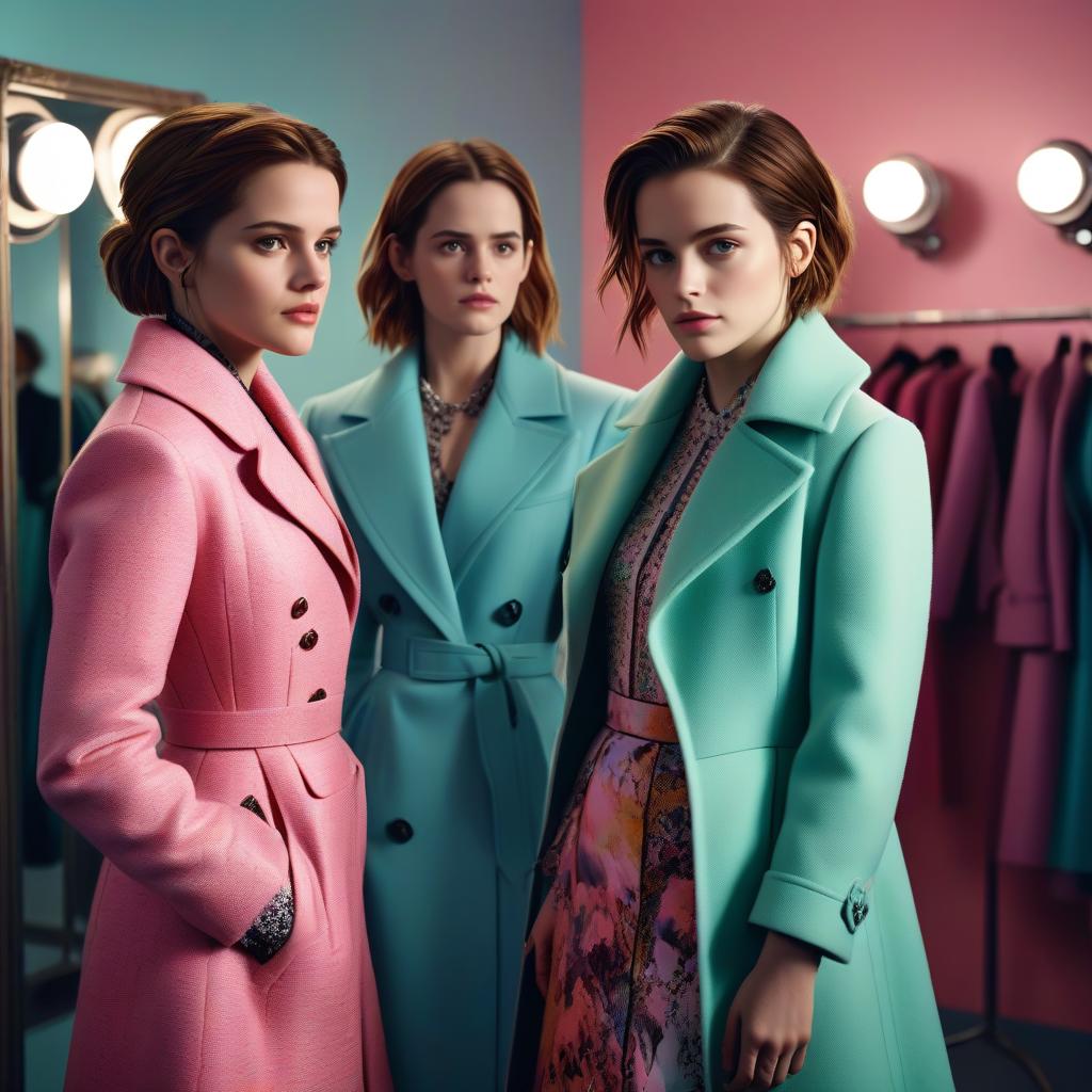 Fantasy fashion shoot featuring Emma Watson and Kristen Stewart in a dressing room, wearing structured coats and vibrant printed dresses, photorealistic and ultra-detailed, pastel colors, soft lighting, beautifully color graded, shot on 100mm lens, f2.2, 30K resolution, cinematic lighting with high realism and intricate detail