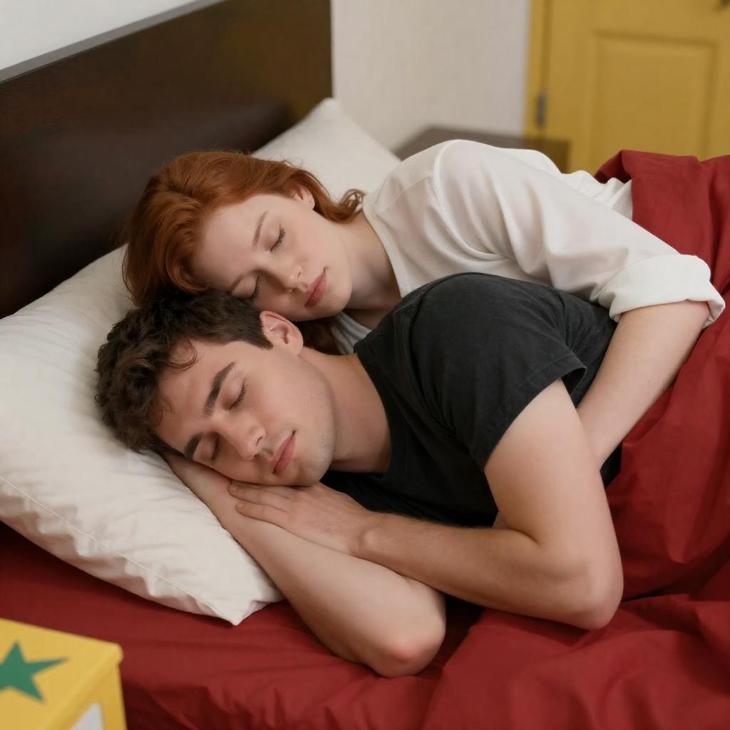 Photograph of a red-haired woman with fair skin and a white blouse, lying on top of a dark-haired man with medium skin and a black shirt, both asleep in a bed with a red blanket. The man rests his head on a white pillow. The background includes a dark headboard and a yellow door. A yellow and green star-shaped box is in the bottom left corner.