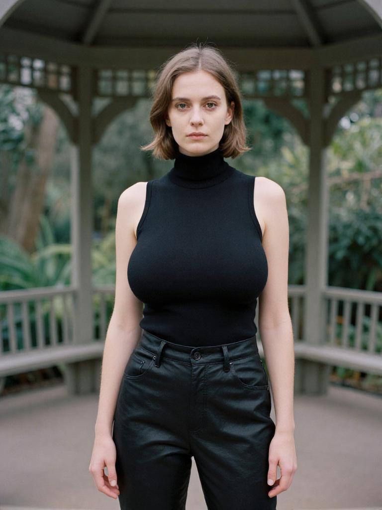 A Petite woman, in a minimalist sleeveless black turtleneck and fitted black faux leather pants, stands under a gazebo in a botanical garden, captured in a lithographic film style. Sexy. Pretty face and beаutiful eyes. Big breasts