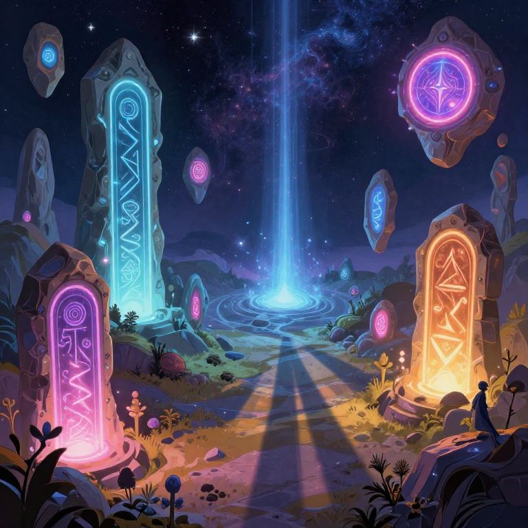 Digital artwork of a mystical night scene with glowing, neon-encrusted stone pillars, a central blue waterfall, and floating runes under a starry