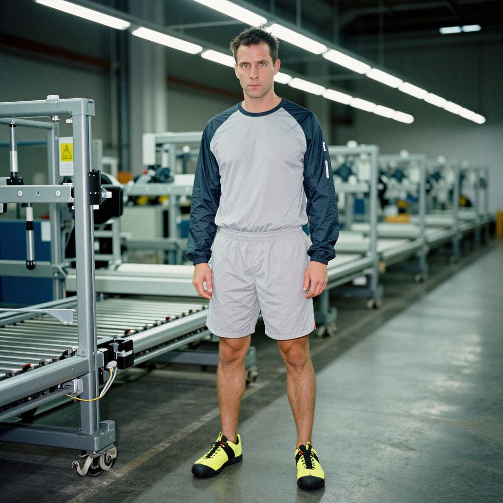 Photograph of a Caucasian man with short, dark brown hair, standing in a brightly lit industrial warehouse. He wears a long-sleeve, white and navy blue baseball shirt, white athletic shorts, and neon yellow and black sneakers. The man stands centered, looking directly at the camera with a neutral expression. Behind him are multiple metal conveyor belts, stacked with various industrial equipment and supplies. The warehouse has a high ceiling with fluorescent lights and concrete floors. The overall atmosphere is utilitarian and functional.