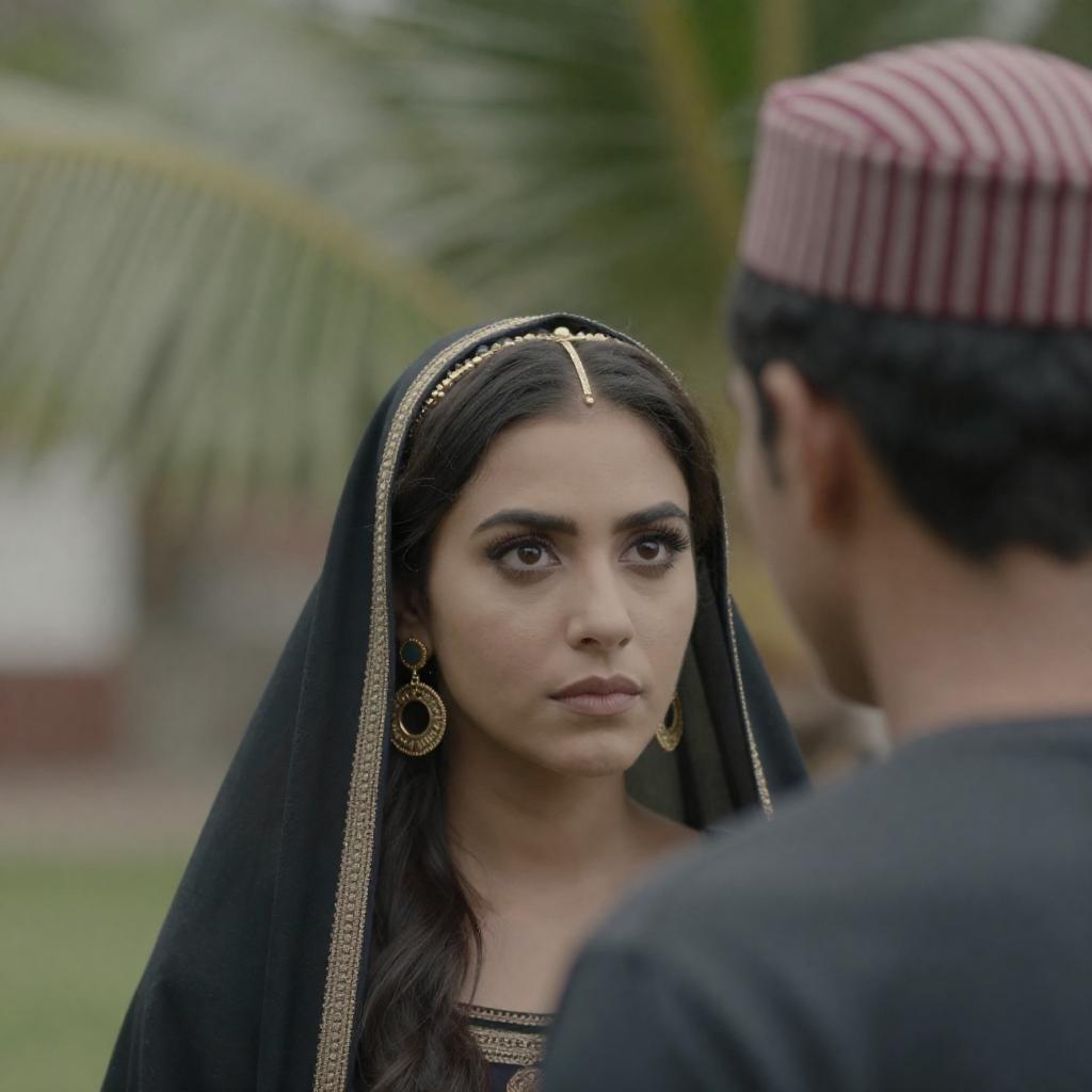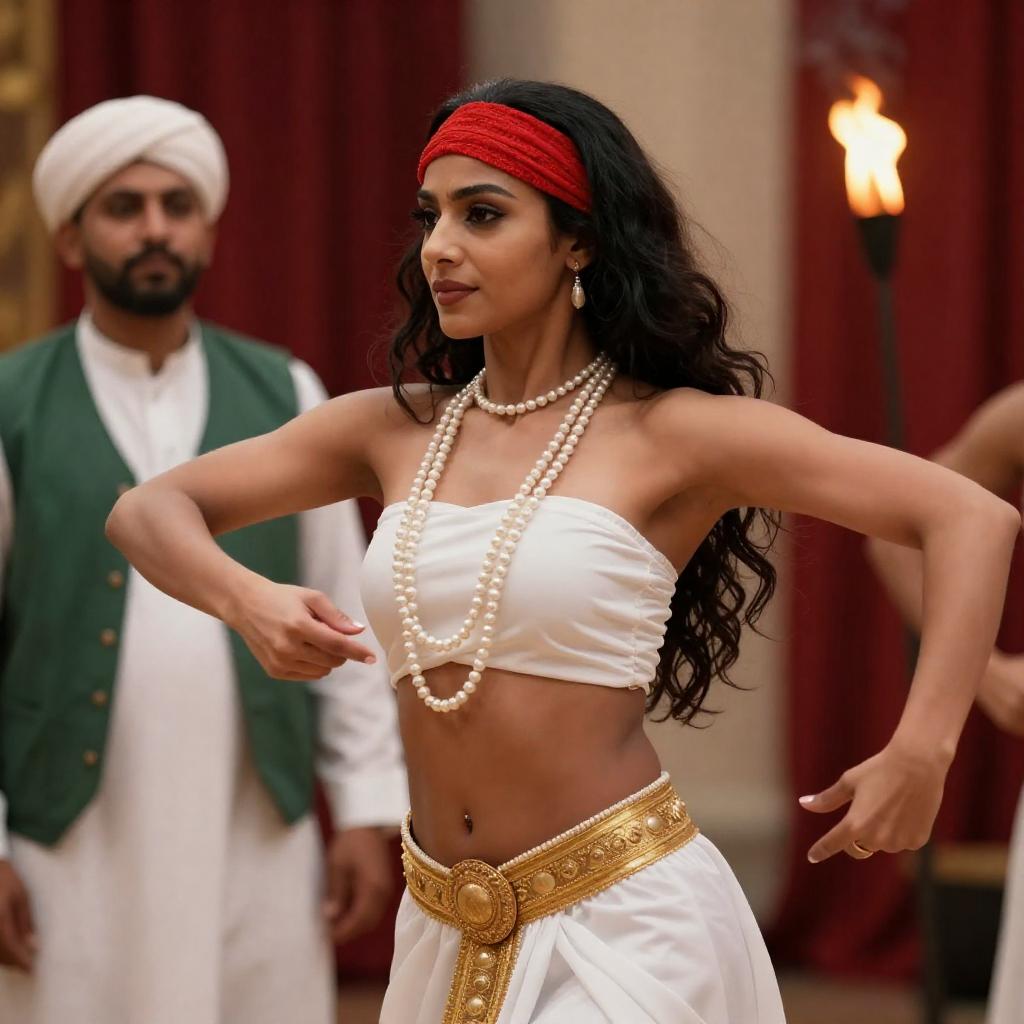 A woman with long black hair and a red headband performs a dance. She wears a white, strapless top, pearl necklaces, and a white skirt with a gold belt. Her arms are extended, and she looks to the side. A man in a white turban and green vest watches her. Red curtains and a torch in the background. Another person partially visible in the background.