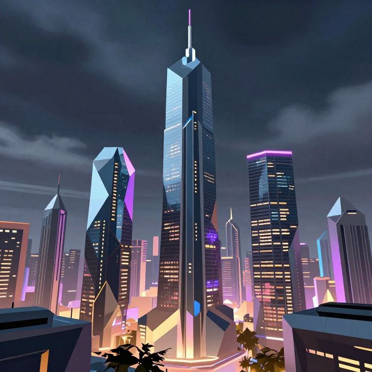 Low poly artist designing a futuristic cityscape, with towering polygonal skyscrapers, sharp angles, and neon lighting under a dark cloudy sky, high-tech vibe, digital fantasy environment with crisp geometric shapes.
