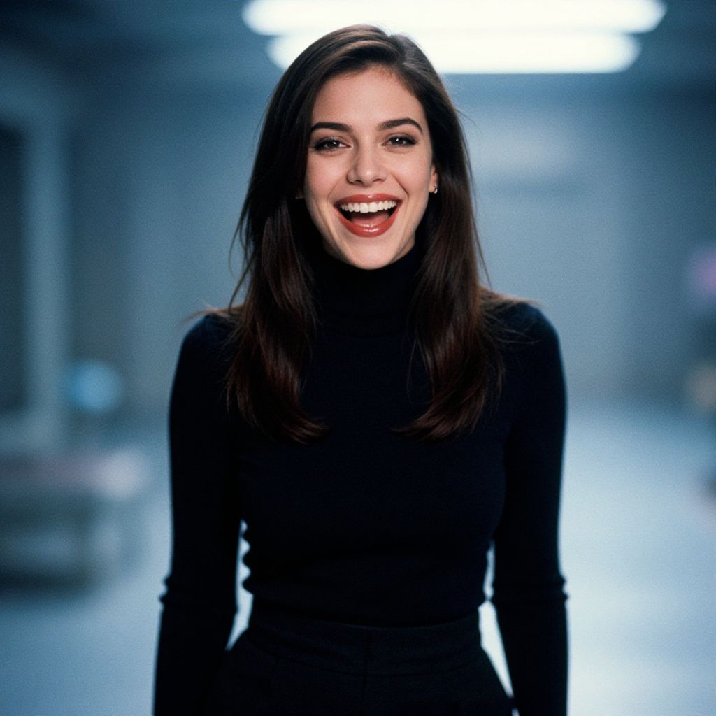 Photo of beautiful (ElizJ0li3_HM_V2-135:0.99), a woman, perfect hair, laughing, (modern photo), wearing turtleneck and long pants, portrait, 85mm, (analog, cinematic, film grain:1.3), (__advancedWildcardsScienceFictionKit_v10/advanced-science-fiction-locations__), detailed eyes, professional pose, painted lips, (epiCPhoto), (looking at viewer:1.1), (cinematic shot:1.3), (natural lighting, lit from above)