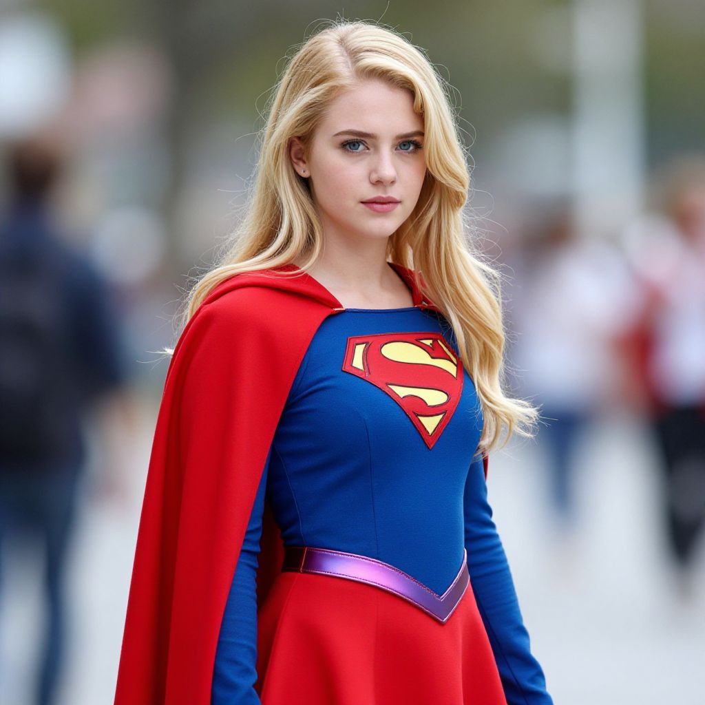 Photograph of a young blonde woman with fair skin, wearing a detailed Supergirl costume. The costume features a red cape, blue bodysuit with a large red "S" emblem on the chest, and a purple belt. She has long, wavy hair and blue eyes, with a serious expression. The background is blurred but shows an outdoor urban setting with indistinct figures and greenery. The image is brightly lit, emphasizing her costume's vibrant colors. Her physique is slender and athletic. The overall style is realistic, with high attention to costume detail and texture.