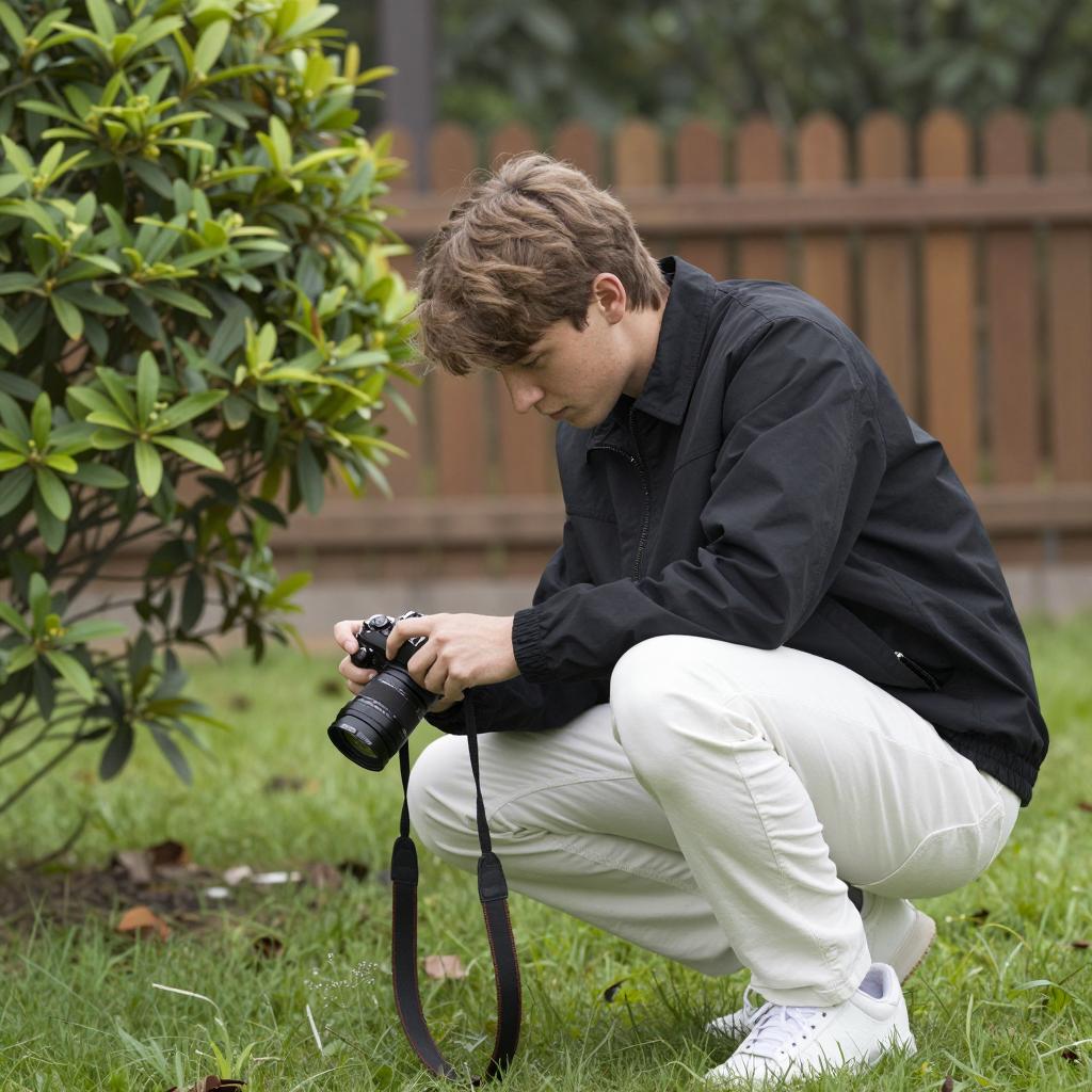 Young man with light brown hair, wearing a black jacket and white pants, crouches on grass, holding a camera, looking down. Bush with green leaves on the left, wooden fence in the background, trees behind the fence.