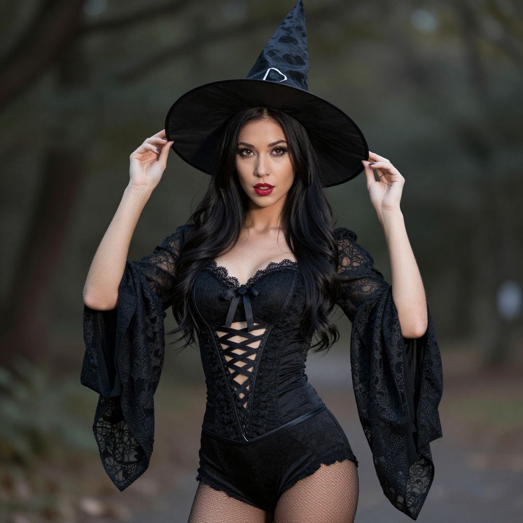Photograph of a slender woman with long, wavy black hair, wearing a black witch costume. She has a pointed, velvet hat with a silver buckle, and a lace-trimmed, black corset with crisscross lacing and long, sheer sleeves. Her fishnet stockings contrast with her black shorts. Her red lipstick and intense gaze add a dramatic flair. She stands in a forest with blurred trees and a dark, mossy path in the background, creating a mysterious, enchanting atmosphere. The image has a sharp focus on the woman, with a soft, bokeh effect in the background.