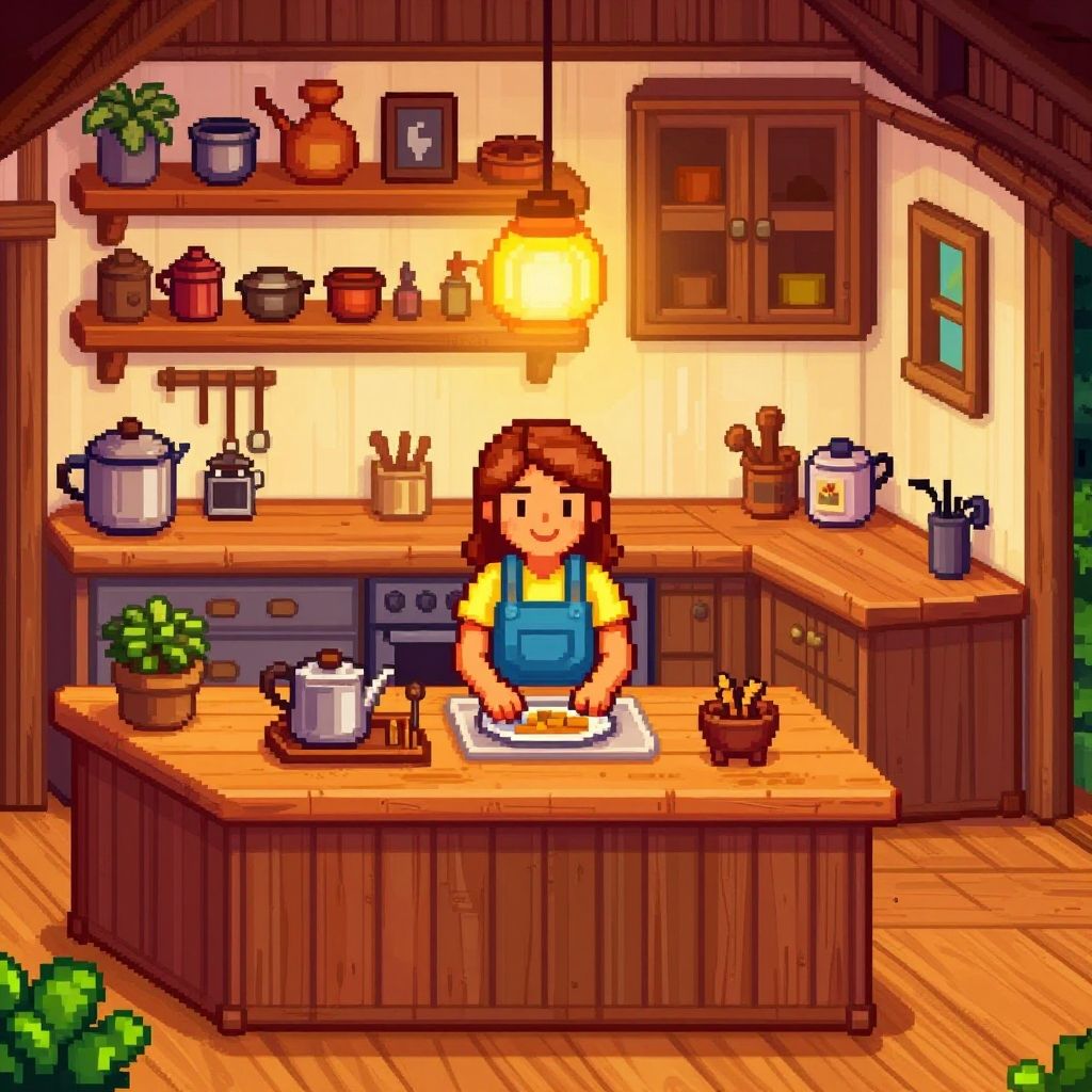 Caroline Stardew working happily in a cozy farmhouse kitchen, rustic decor, warm lighting, detailed pixel art style, charming and inviting scene