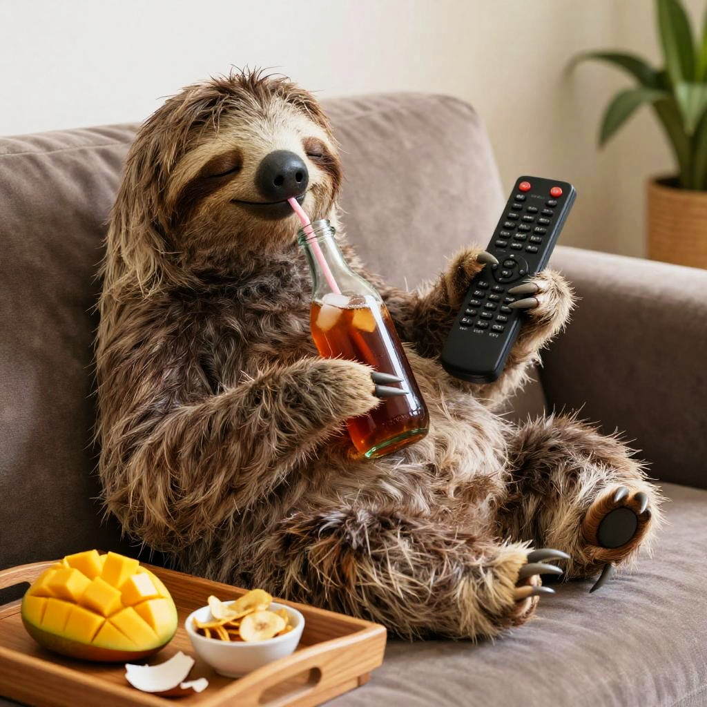 Anthropomorphic sloth, shaggy tawny-brown fur, long limbs with curved claws lounging slouched on a soft, overstuffed couch, holding a glass bottle of iced hibiscus tea with a straw in one hand and a chunky retro TV remote in the other, sipping from the bottle through the straw while lazily reaching for the remote, half-closed, sleepy eyes looking directly at the viewer with a gentle, drowsy smile, wooden tray on the coffee table with sliced mango, coconut chips, and a small bowl of plantain chips