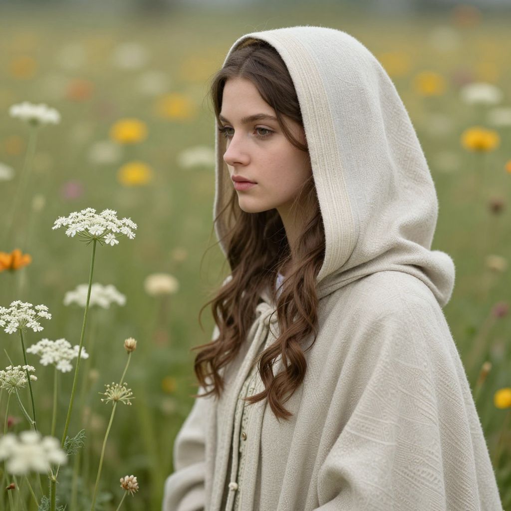 Photograph of a young woman with long, wavy brown hair standing in a vibrant field of wildflowers. She wears a light beige, hooded, embroidered dress with intricate patterns. Her hood is up, partially covering her face, which has a serene, contemplative expression. She holds a small bouquet of white Queen Anne's lace flowers in her right hand. The background is a blurred meadow filled with yellow, white, and orange wildflowers, with a green, tree-lined horizon under a cloudy sky. The overall mood is peaceful and natural.