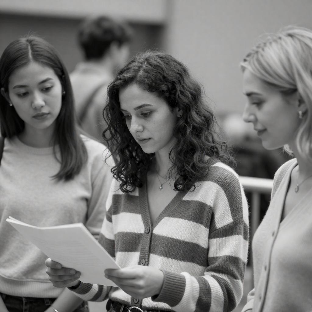 Photograph of a crowded theater. People seated in rows, facing forward. Dark wood-paneled walls, dirty carpet. Casual clothing, varied. Dim lighting, some smoking. Audience members look forward, some smiling. Front left empty seat. Smoky atmosphere. 20-30 people.