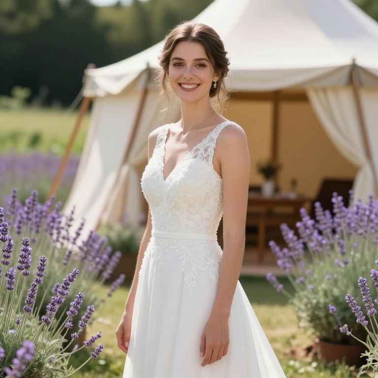 Photograph of a smiling young woman with light skin and dark brown, wavy hair in an updo, wearing a white, sleeveless lace wedding dress with a V-neckline. She stands in a sunlit lavender field, with purple lavender flowers in the foreground. In the background, there's a white canvas tent with beige interior and curtained entrance. The scene is bright and lush, with a green, forested area in the distance. The woman's dress is detailed with subtle floral embroidery, and she wears small, simple earrings. The overall mood is joyful and natural.
