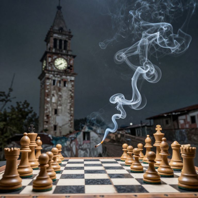 Rooks built entirely of cigarette smoke engage in an endless game of chess above a derelict clock tower.