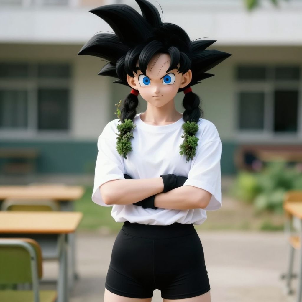 Score_9, score_8_up, score_7_up, score_6_up, score_5_up, score_4_up, rating_explicit, 20 years old, masterpiece, (realistic, photo-realistic:1.37), perfect illumination, photo-realism, snapshot, (videl dragonball, blue big eyes, black bike shorts, white oversized shirt, bush, black gloves, pigtails, crossed arms), pale skin, at the school, detailed background, medium breasts vibrant colors, subsurface scattering, detailed light, detailed shadow, zPDXL