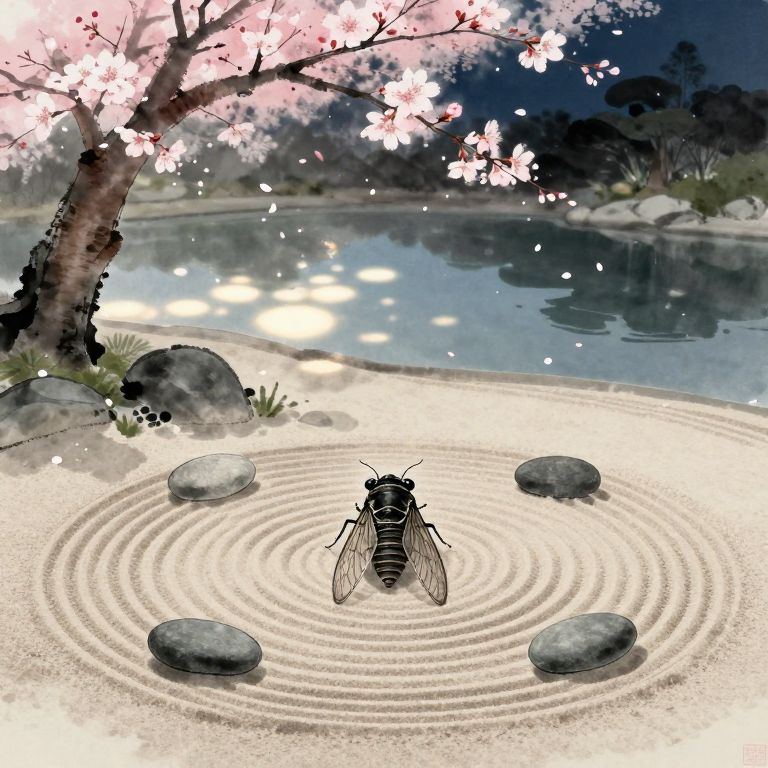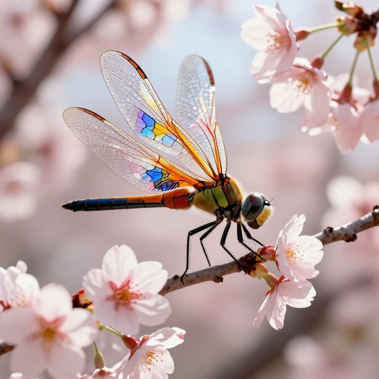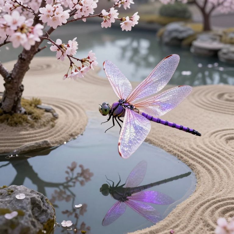 Imagine a serene garden in the tranquil style reminiscent of Japanese ink wash painting, capturing a delicate insect perched on a lotus blossom. From an unusual perspective, akin to a \"worm's-eye view,\" observe this exquisite creature with iridescent wings, a translucent body shimmering like an oil slick, and elongated eyes that hold secrets of the world within them. The background features a tranquil koi pond with rippling water reflecting a vibrant cherry blossom tree, evoking a profound sense of peace and harmony in this captivating microcosm.