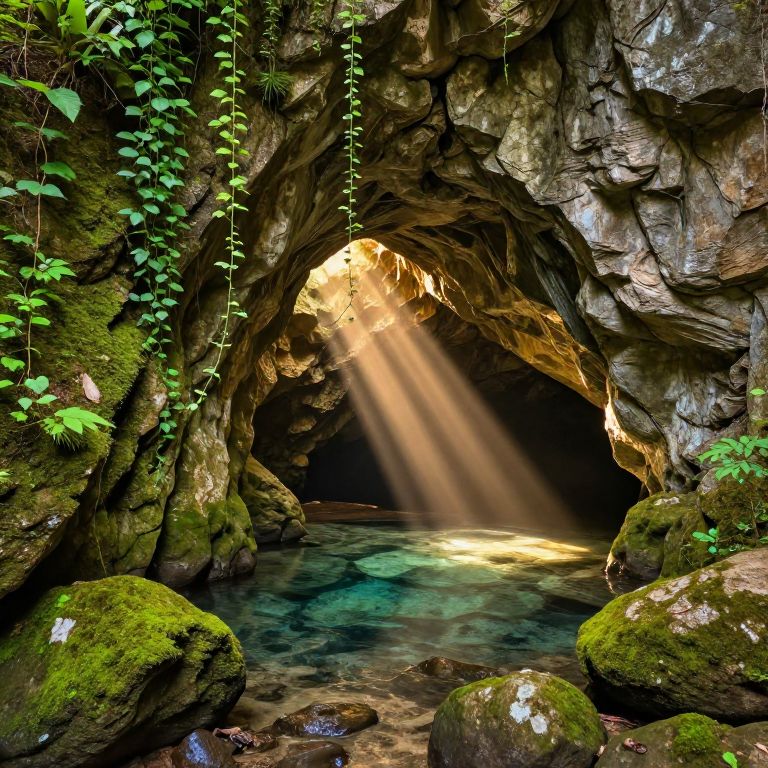 Photograph of a natural cave entrance with sunlight streaming through, illuminating the dark interior. The cave's rocky walls are textured and covered in moss. Green ivy drapes from the top left. The cave floor is a clear, shallow pool, reflecting the sunlight. Large, moss-covered boulders surround the entrance. The light creates a dramatic contrast between the dark cave and the bright, sunlit pool. The overall scene has a magical, serene atmosphere, with rich greens and browns dominating the color palette.