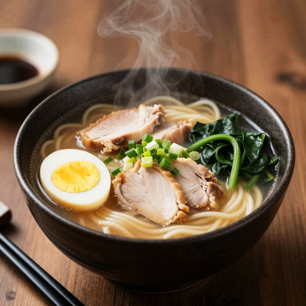 Wide shot, still life, food focus, ramen, bowl, noodles, meat, steam, realistic, photorealistic, table, soup, spring onion, vegetable, egg (food), chopsticks, no humans, stoneware, chicken, spinach, poached
