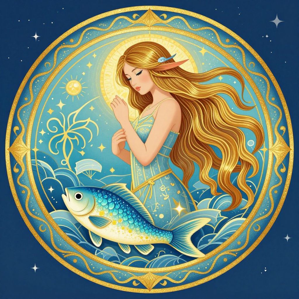 A vibrant, intricate illustration of a Pisces zodiac sign, featuring a woman with long hair and fish, set within a circular frame adorned with gold and blue patterns.