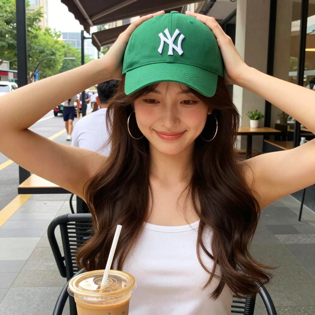 Photograph of a young Asian woman with long, wavy brown hair wearing a green New York Yankees baseball cap, white tank top, and large silver hoop earrings. She is seated outdoors at a street café with black metal chairs and tables, holding her cap with both hands and smiling softly. A plastic cup of iced coffee with a straw is on the table in front of her. The urban background includes blurred pedestrians, trees, and café storefronts under a sunny sky.