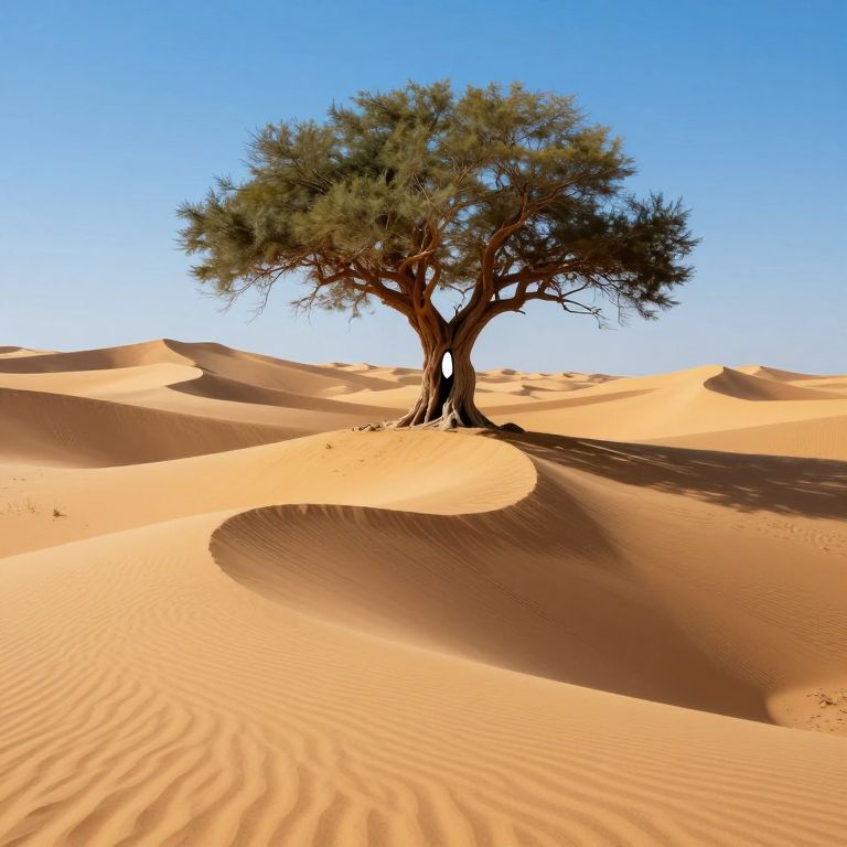 Imagine an enigmatic desert landscape where dunes morph into sinuous curves and waves, under a brilliant azure sky that bathes the scene in golden light. At its heart stands an ancient tree with limbs stretching towards the celestial realm, its hollow trunk concealing a mesmerizing portal to another dimension. This surreal tableau captures a dreamlike atmosphere, blending natural elements with the impossible, creating a hauntingly beautiful and thought-provoking visual experience that invites viewers to delve into the mysterious depths of their own subconscious.