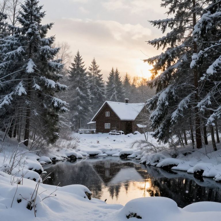 Photograph of a serene winter landscape at sunset. A dark wooden cabin with a snow-covered roof is centered in the background, surrounded by tall, snow-laden evergreen trees. A calm, reflective stream runs through the foreground, bordered by snow-covered rocks and grass. The sky is a mix of soft yellow and gray, with the sun peeking through the trees, creating a warm glow. The scene exudes tranquility and natural beauty, with crisp white snow contrasting against the dark wood and greenery.