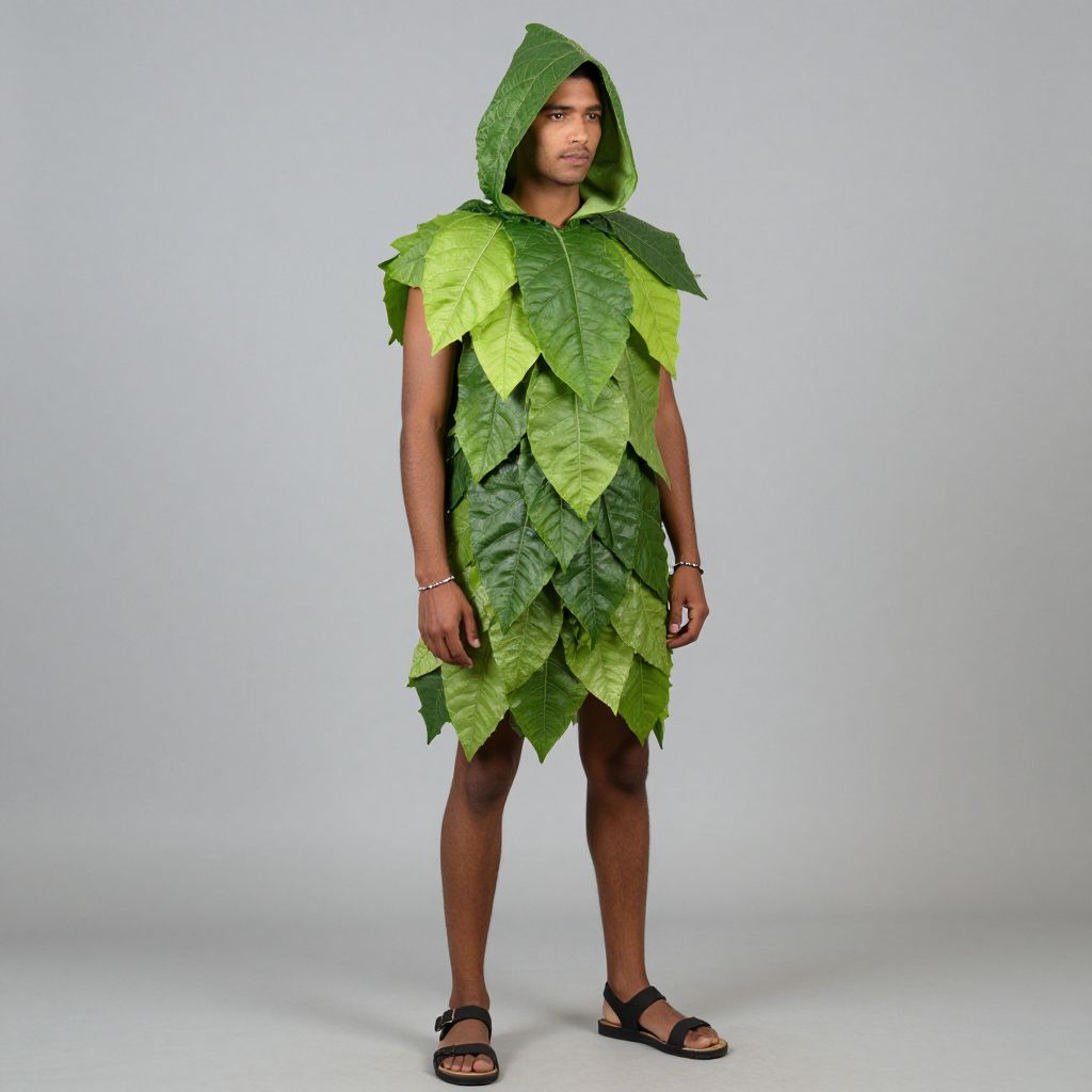 Green leaf costume, solo, 1boy, male focus, hood, standing, bracelet, realistic, sandals